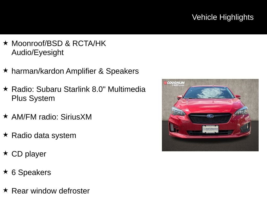 Lithium Red Pearl 2017 Subaru Impreza 2.0i Sport AWD CVT Lineartronic 2.0L 4-Cylinder DOHC 16V Impreza 2.0i Sport, 4D Sedan, 2.0L 4-Cylinder DOHC 16V, CVT Lineartronic, AWD, Lithium Red Pearl, Black Cloth, 18 x 7.5J Aluminum Alloy Wheels, 4-Wheel Disc Brakes, 6 Speakers, ABS brakes, Air Conditioning, All-Weather Floor Mats, Alloy wheels, AM/FM radio: SiriusXM, Apple CarPlay/Android Auto, Auto-Dimming Mirror w/Compass & HomeLink, Blind Spot Detection, Brake assist, Bumpers: body-color, Cargo Tray, CD player, Delay-off headlights, Driver door bin, Driver vanity mirror, Dual front impact airbags, Dual front side impact airbags, Electronic Stability Control, Emergency communication system, Exterior Parking Camera Rear, EyeSight System, Four wheel independent suspension, Front anti-roll bar, Front Bucket Seats, Front Center Armrest, Front reading lights, Fully automatic headlights, harman/kardon Amplifier & Speakers, Heated door mirrors, Heated front seats, Heated Reclining Front Bucket Seats, Illuminated entry, Knee airbag, Leather Shift Knob, Lithium Red Pearl Body Side Molding, Low tire pressure warning, Moonroof/BSD & RCTA/HK Audio/Eyesight, Occupant sensing airbag, Outside temperature display, Overhead airbag, Panic alarm, Passenger door bin, Passenger vanity mirror, Power door mirrors, Power Moonroof, Power steering, Power windows, Radio data system, Radio: Subaru Starlink 8.0 Multimedia Plus System, Rear anti-roll bar, Rear Bumper Applique, Rear Cross Traffic Alert, Rear window defroster, Remote keyless entry, Security system, Speed control, Speed-sensing steering, Split folding rear seat, Spoiler, Sport Cloth Upholstery, Steering wheel mounted audio controls, Tachometer, Telescoping steering wheel, Tilt steering wheel, Traction control, Trip computer, Turn signal indicator mirrors, Variably intermittent wipers.
