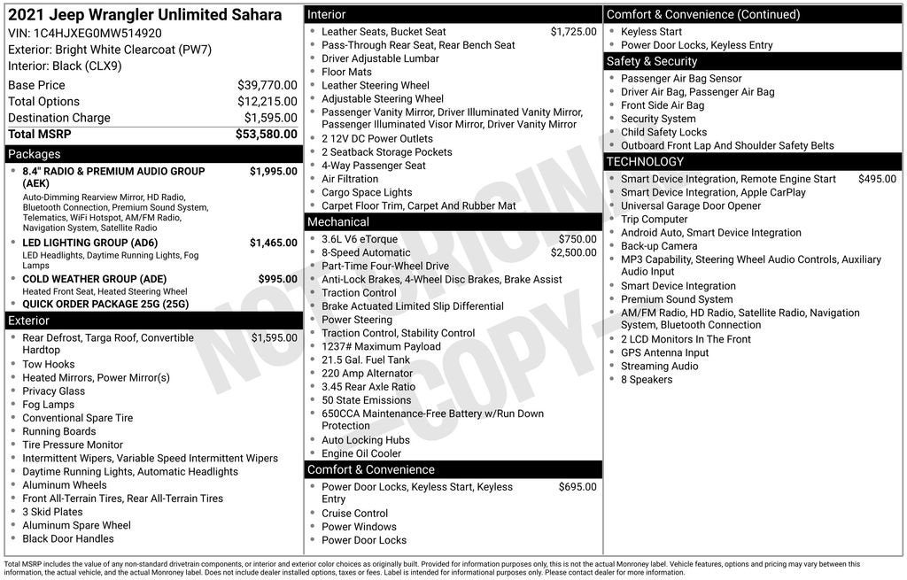 Bright White Clearcoat 2021 Jeep Wrangler Unlimited SaharaPlease call or e-mail first for the best and quickest information. Visit www.coughlinpataskala.com to see more of this store’s new and used vehicle inventory for sale. Price excludes tax, title, license and document fee. While we make every effort to prevent pricing errors, key stroke and human errors do occur. Please contact dealer for details.