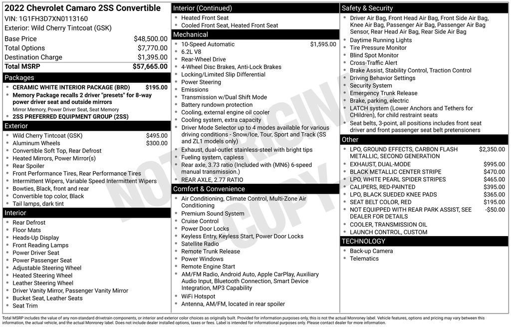 At Coughlin Chevrolet, Buick, GMC in Chillicothe we offer all our pre-owned inventory at market based pricing to insure a no haggle experience and a fair price right up front.2.77 Rear Axle Ratio, 4-Wheel Disc Brakes, 6-Way Power Front Passenger Seat Adjuster, 7 Speakers, 8-Way Power Driver Seat Adjuster, ABS brakes, Air Conditioning, Alloy wheels, AM/FM radio: SiriusXM with 360L, Apple CarPlay/Android Auto, Auto-dimming door mirrors, Automatic temperature control, Black Metallic Center Stripe, Black Sueded Knee Pads (LPO), Bluetooth® For Phone, Bose Premium 7-Speaker Audio System Feature, Brake assist, Bumpers: body-color, Ceramic White Interior Package, Compass, Convertible roof lining, Custom Launch Control, Delay-off headlights, Driver door bin, Driver vanity mirror, Dual front impact airbags, Dual front side impact airbags, Dual Mode Exhaust, Electronic Stability Control, Exterior Parking Camera Rear, Four wheel independent suspension, Front anti-roll bar, Front Bucket Seats, Front Center Armrest, Front dual zone A/C, Front reading lights, Front Sport Bucket Seats, Fully automatic headlights, Glass rear window, Heads-Up Display, Heated door mirrors, Heated Driver & Front Passenger Seats, Heated front seats, Heated steering wheel, Illuminated entry, Knee airbag, Leather Shift Knob, Leather-Trimmed Seat Trim, Low tire pressure warning, Memory seat, Not Equipped w/Rear Park Assist, Occupant sensing airbag, Outside temperature display, Paddle-Shift Manual Controls, Panic alarm, Passenger door bin, Passenger vanity mirror, Power convertible roof, Power door mirrors, Power driver seat, Power passenger seat, Power steering, Power windows, Preferred Equipment Group 2SS, Premium audio system: Chevrolet Infotainment System, Radio data system, Radio: Chevrolet Infotainment 3 Plus System, Rear anti-roll bar, Rear Park Assist, Rear window defroster, Red Seat Belt Color, Red-Painted Calipers, Remote keyless entry, Remote Vehicle Starter System, Second Generation Ground Effects (LPO), Security system, SiriusXM w/360L, Speed control, Speed-sensing steering, Spoiler, Steering wheel mounted audio controls, Tachometer, Telescoping steering wheel, Tilt steering wheel, Traction control, Transmission Oil Cooler, Trip computer, Variably intermittent wipers, Ventilated Driver & Front Passenger Seats, Ventilated front seats, Voltmeter, Wheels: 20 x 8.5 Fr & 20 x 9.5 Rr 5-Spoke, Wheels: 20 x 8.5 Fr & 20 x 9.5 Rr 5-Spoke Alum, White Pearl Spider Stripes (LPO). 2022 Chevrolet Camaro 2SS Clean CARFAX.We carry all makes and models and have vehicles in all different colors. Our Pre-owned Vehicles could have some of the following features listed: Alloy wheels, aluminum wheels, backup camera, Bluetooth®, cargo package, chrome wheels, convenience package, leather seats, navigation system, power package, remote start, se package, safety package, sunroof/moonroof, tow package, adaptive cruise control, comfort package, tow package, trailer package, appearance package, cargo package, power package, safety package, acoustical package, dvd entertainment system, preferred package, technology package, driver confidence package, audio package, heat package, memory package, off road package, premium package, premium sound package, remote vehicle starter prep package, skid plate package, solid smooth ride suspension package, sound package, sport package, steel wheels, suspension package, z71 package, 3rd row seat, Bluetooth®, hands-free, cd player, cruise control, dvd player. Keyless entry, lift kit, multi-zone climate control, navigation, portable audio connection, power locks, power windows, premium audio, security system, steering wheel controls, sunroof, trailer hitch, apple carplay/android auto, brake assist, homelink, memory seat, stability control, android auto, apple carplay.