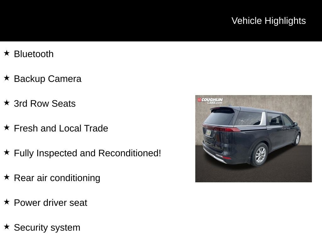 Bluetooth®, Backup Camera, 3rd Row Seats, Fresh and Local Trade, Fully Inspected and Reconditioned!, Alloy wheels, Apple CarPlay & Android Auto, Leather Shift Knob, Leather steering wheel, Power driver seat, Rear air conditioning, Security system. 19/26 City/Highway MPG