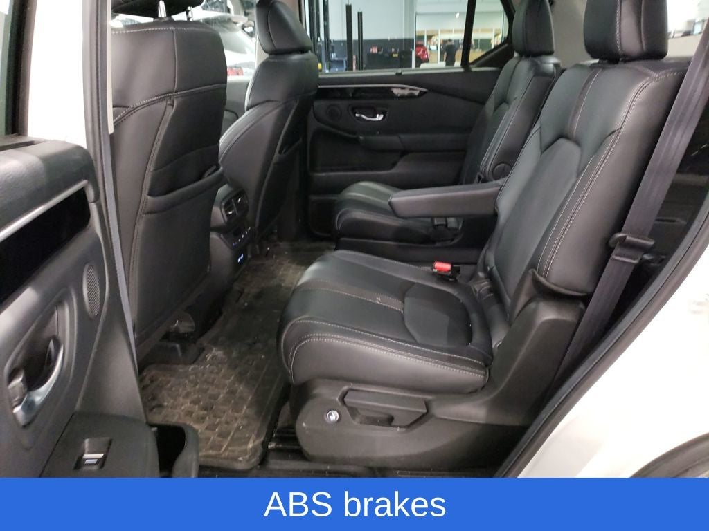 Platinum White Pearl 2023 Honda Pilot EX-L 7 Passenger AWD 10-Speed Automatic 3.5L V6 DOHC 24V Pilot EX-L 7 Passenger, 4D Sport Utility, 3.5L V6 DOHC 24V, 10-Speed Automatic, AWD, Platinum White Pearl, Black w/Leather Seat Trim, 3rd row seats: split-bench, 4-Wheel Disc Brakes, 9 Speakers, ABS brakes, Adaptive Cruise Control: Adaptive Cruise Control (ACC) with Low-Speed Follow, Air Conditioning, Alloy wheels, AM/FM radio: SiriusXM, Apple CarPlay/Android Auto, Auto High-beam Headlights, Auto-dimming Rear-View mirror, Automatic temperature control, Axle Ratio: 4.167, Blind Spot Information (BSI) System warning, Brake assist, Delay-off headlights, Driver vanity mirror, Dual front impact airbags, Dual front side impact airbags, Electronic Stability Control, Emergency communication system: HondaLink Assist, Four wheel independent suspension, Front anti-roll bar, Front Center Armrest, Front dual zone A/C, Front fog lights, Front reading lights, Fully automatic headlights, Garage door transmitter: HomeLink, Heated door mirrors, Heated Front Bucket Seats, Heated front seats, Knee airbag, Lane departure: Lane Keeping Assist System (LKAS) active, Leather Seat Trim, Low tire pressure warning, Memory seat, Occupant sensing airbag, Outside temperature display, Overhead airbag, Overhead console, Panic alarm, Passenger door bin, Passenger vanity mirror, Power door mirrors, Power driver seat, Power Liftgate, Power passenger seat, Power steering, Power windows, Radio data system, Radio: 245-Watt Audio System, Rear air conditioning, Rear anti-roll bar, Rear reading lights, Rear window defroster, Rear window wiper, Reclining 3rd row seat, Remote keyless entry, Security system, Speed control, Speed-sensing steering, Speed-Sensitive Wipers, Split folding rear seat, Spoiler, Steering wheel mounted audio controls, Tachometer, Telescoping steering wheel, Tilt steering wheel, Traction control, Trip computer, Turn signal indicator mirrors, Variably intermittent wipers, Wheels: 18 Machined Face Pewter Gray.