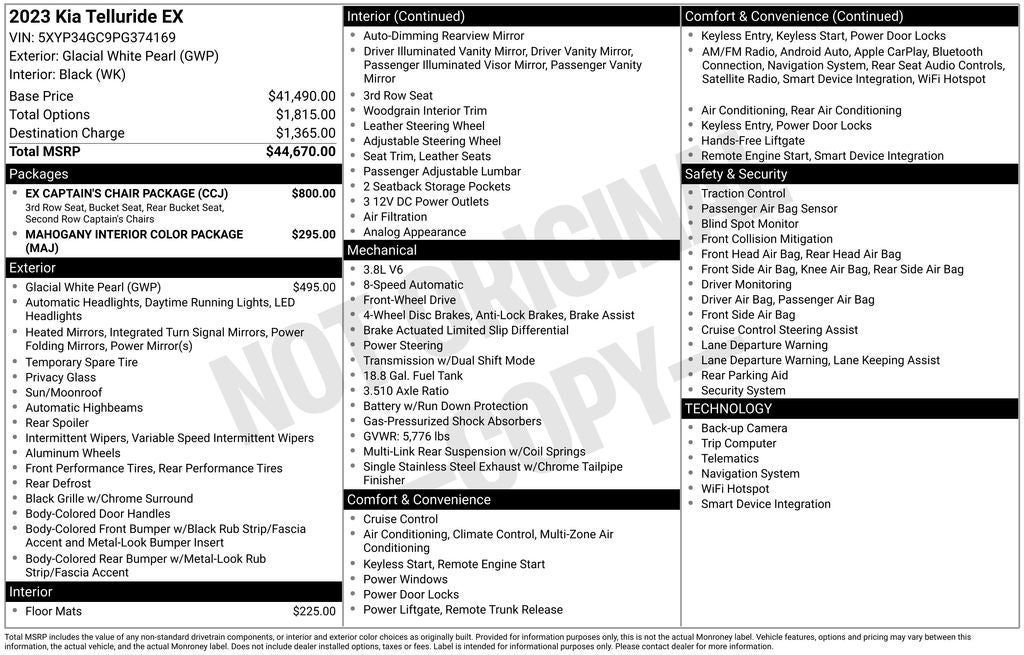 Equipped with EX Captain's Chair Package (2nd Row Captain Chairs), Mahogany Interior Color Package, Kia Certified Pre-Owned Certified, 3.510 Axle Ratio, 3rd row seats: split-bench, 4-Wheel Disc Brakes, 6 Speakers, ABS brakes, Air Conditioning, Alloy wheels, AM/FM radio: SiriusXM, Apple CarPlay & Android Auto, Auto High-beam Headlights, Auto-dimming Rear-View mirror, Automatic temperature control, Brake assist, Bumpers: body-color, Carpet Floor Mats, Compass, Delay-off headlights, Driver door bin, Driver vanity mirror, Dual front impact airbags, Dual front side impact airbags, Electronic Stability Control, Emergency communication system: 911 Connect, Exterior Parking Camera Rear, Four wheel independent suspension, Front anti-roll bar, Front Bucket Seats, Front Center Armrest, Front dual zone A/C, Front reading lights, Fully automatic headlights, Heated & Ventilated Front Bucket Seats, Heated door mirrors, Heated front seats, Illuminated entry, Knee airbag, Leather Seat Trim, Leather Shift Knob, Leather steering wheel, Low tire pressure warning, Navigation System, Occupant sensing airbag, Outside temperature display, Overhead airbag, Overhead console, Panic alarm, Passenger door bin, Passenger vanity mirror, Power door mirrors, Power driver seat, Power Liftgate, Power moonroof, Power passenger seat, Power steering, Power windows, Radio data system, Radio: AM/FM Display Audio System, Rear air conditioning, Rear anti-roll bar, Rear audio controls, Rear reading lights, Rear seat center armrest, Rear side impact airbag, Rear window defroster, Rear window wiper, Reclining 3rd row seat, Remote keyless entry, Roof rack: rails only, Security system, Smart Key w/ Push Button and Remote Start, Speed control, Speed-sensing steering, Split folding rear seat, Spoiler, Steering wheel mounted audio controls, Tachometer, Telescoping steering wheel, Tilt steering wheel, Traction control, Trip computer, Turn signal indicator mirrors, Variably intermittent wipers, Ventilated front seats, and Wheels: 20 x 7.5 Black Finish.