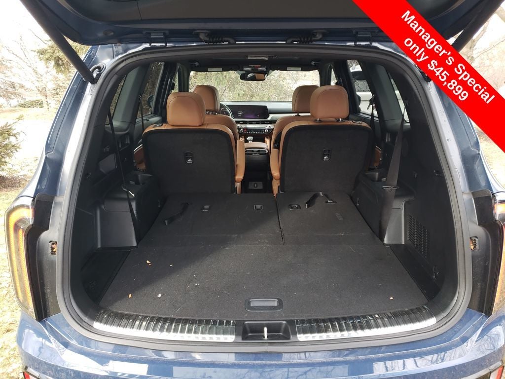Equipped with Terracotta Interior Color Package, 10 Speakers, 3.648 Axle Ratio, 3rd row seats: split-bench, 4-Wheel Disc Brakes, ABS brakes, Air Conditioning, Alloy wheels, AM/FM radio: SiriusXM, Apple CarPlay & Android Auto, Auto High-beam Headlights, Auto-dimming Rear-View mirror, Auto-leveling suspension, Automatic temperature control, Brake assist, Bumpers: body-color, Carpet Floor Mats, Compass, Delay-off headlights, Driver door bin, Driver vanity mirror, Dual front impact airbags, Dual front side impact airbags, Electronic Stability Control, Emergency communication system: 911 Connect, Exterior Parking Camera Rear, Four wheel independent suspension, Front anti-roll bar, Front Bucket Seats, Front Center Armrest, Front dual zone A/C, Front fog lights, Front reading lights, Fully automatic headlights, Garage door transmitter: HomeLink, harman/kardon® Speakers, Heated & Ventilated Front Bucket Seats, Heated door mirrors, Heated front seats, Heated steering wheel, Illuminated entry, Knee airbag, Leather Seat Trim, Leather Shift Knob, Leather steering wheel, Low tire pressure warning, Memory seat, Navigation System, Occupant sensing airbag, Outside temperature display, Overhead airbag, Overhead console, Panic alarm, Passenger door bin, Passenger vanity mirror, Power door mirrors, Power driver seat, Power Liftgate, Power moonroof, Power passenger seat, Power steering, Power windows, Radio data system, Radio: AM/FM Harman Kardon Audio System, Rear air conditioning, Rear anti-roll bar, Rear audio controls, Rear reading lights, Rear side impact airbag, Rear window defroster, Rear window wiper, Reclining 3rd row seat, Remote keyless entry, Roof rack: rails only, Security system, Smart Key w/ Push Button and Remote Start, Speed control, Speed-sensing steering, Split folding rear seat, Spoiler, Steering wheel mounted audio controls, Tachometer, Telescoping steering wheel, Tilt steering wheel, Traction control, Trip computer, Turn signal indicator mirrors, Variably intermittent wipers, Ventilated front seats, and Wheels: 20 x 7.5 Black Finish X-LINE Exclusive.