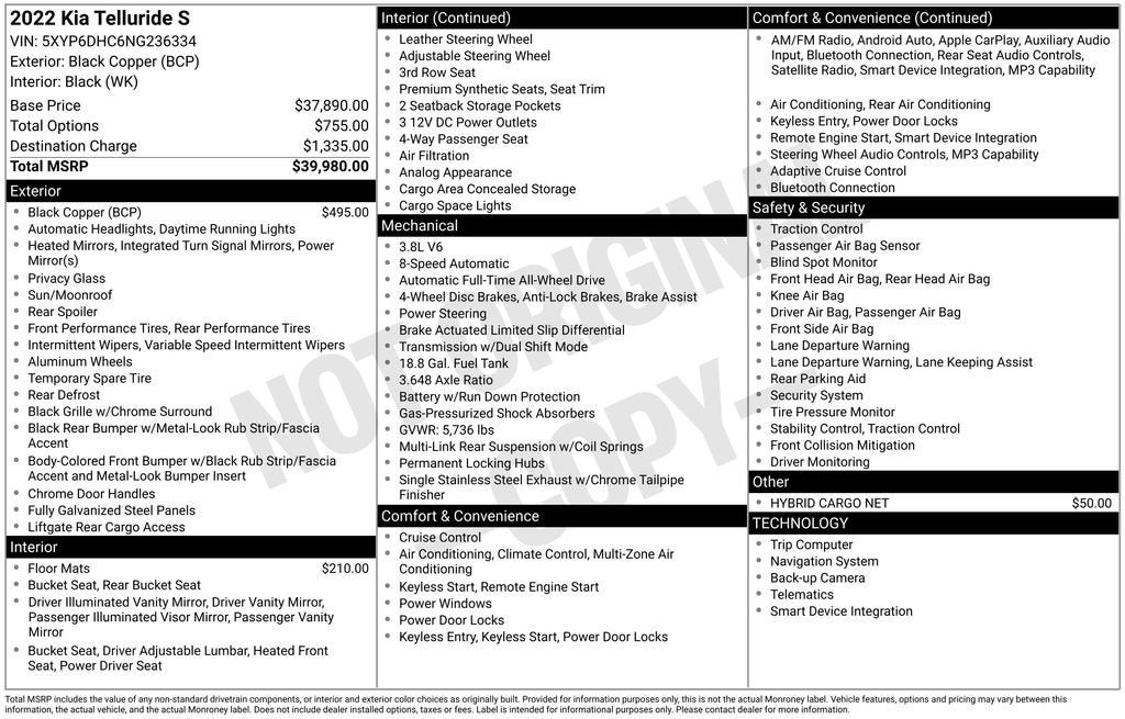 Black Copper 2022 Kia Telluride S CARFAX One-Owner.