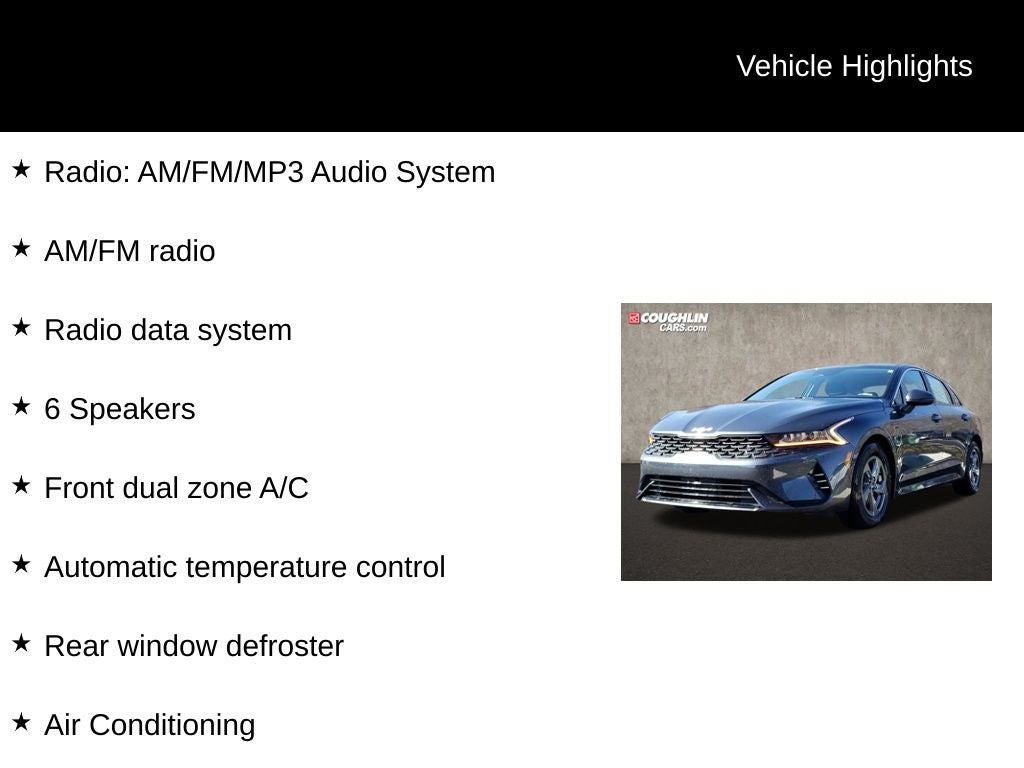 Gravity Gray 2023 Kia K5 LXS FWD 8-Speed Automatic 1.6L I4 DGI Turbocharged DOHC 16V LEV3-ULEV70 180hp K5 LXS, 4D Sedan, 1.6L I4 DGI Turbocharged DOHC 16V LEV3-ULEV70 180hp, 8-Speed Automatic, FWD, Gravity Gray, Black Cloth, 4-Wheel Disc Brakes, 6 Speakers, ABS brakes, Air Conditioning, Alloy wheels, AM/FM radio, Auto High-beam Headlights, Automatic temperature control, Brake assist, Bumpers: body-color, Carpeted Floor Mats, Cloth Seat Trim, Delay-off headlights, Driver door bin, Driver vanity mirror, Dual front impact airbags, Dual front side impact airbags, Electronic Stability Control, Four wheel independent suspension, Front anti-roll bar, Front Bucket Seats, Front Center Armrest, Front dual zone A/C, Front reading lights, Fully automatic headlights, Heated door mirrors, Illuminated entry, Knee airbag, Low tire pressure warning, Occupant sensing airbag, Outside temperature display, Overhead airbag, Overhead console, Panic alarm, Passenger door bin, Passenger vanity mirror, Power door mirrors, Power steering, Power windows, Radio data system, Radio: AM/FM/MP3 Audio System, Rear anti-roll bar, Rear seat center armrest, Rear side impact airbag, Rear window defroster, Remote keyless entry, Security system, Speed control, Speed-sensing steering, Split folding rear seat, Steering wheel mounted audio controls, Tachometer, Telescoping steering wheel, Tilt steering wheel, Traction control, Trip computer, Variably intermittent wipers, Wheels: 16 Gray Alloy.
