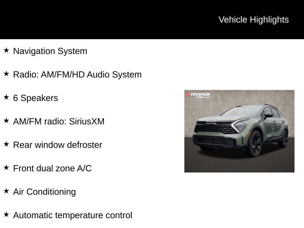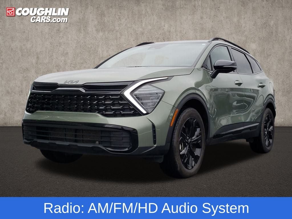 Jungle Green 2025 Kia Sportage X-Line AWD 8-Speed Automatic I4 AWD, 4-Wheel Disc Brakes, 6 Speakers, ABS brakes, Air Conditioning, Alloy wheels, AM/FM radio: SiriusXM, Apple CarPlay & Android Auto, Auto High-beam Headlights, Automatic temperature control, Brake assist, Bumpers: body-color, Carpet Floor Mats X-Line, Compass, Cross Bars X-Line, Delay-off headlights, Driver door bin, Driver vanity mirror, Dual front impact airbags, Dual front side impact airbags, Electronic Stability Control, Emergency communication system, Four wheel independent suspension, Front anti-roll bar, Front Bucket Seats, Front Center Armrest, Front dual zone A/C, Fully automatic headlights, Heated door mirrors, Heated Front Bucket Seats, Heated front seats, Illuminated entry, Leather steering wheel, Low tire pressure warning, Navigation System, Occupant sensing airbag, Outside temperature display, Overhead airbag, Overhead console, Panic alarm, Passenger door bin, Passenger vanity mirror, Power door mirrors, Power driver seat, Power steering, Power windows, Premium Leatherette Seat Trim, Radio: AM/FM/HD Audio System, Rain sensing wipers, Rear anti-roll bar, Rear seat center armrest, Rear side impact airbag, Rear window defroster, Rear window wiper, Remote keyless entry, Security system, Speed control, Speed-sensing steering, Split folding rear seat, Spoiler, Steering wheel mounted audio controls, Tachometer, Telescoping steering wheel, Tilt steering wheel, Tow Hitch w/Harness, Traction control, Trip computer, Turn signal indicator mirrors, Variably intermittent wipers, Wheels: 19 x 7.5J Gloss Black Alloy.